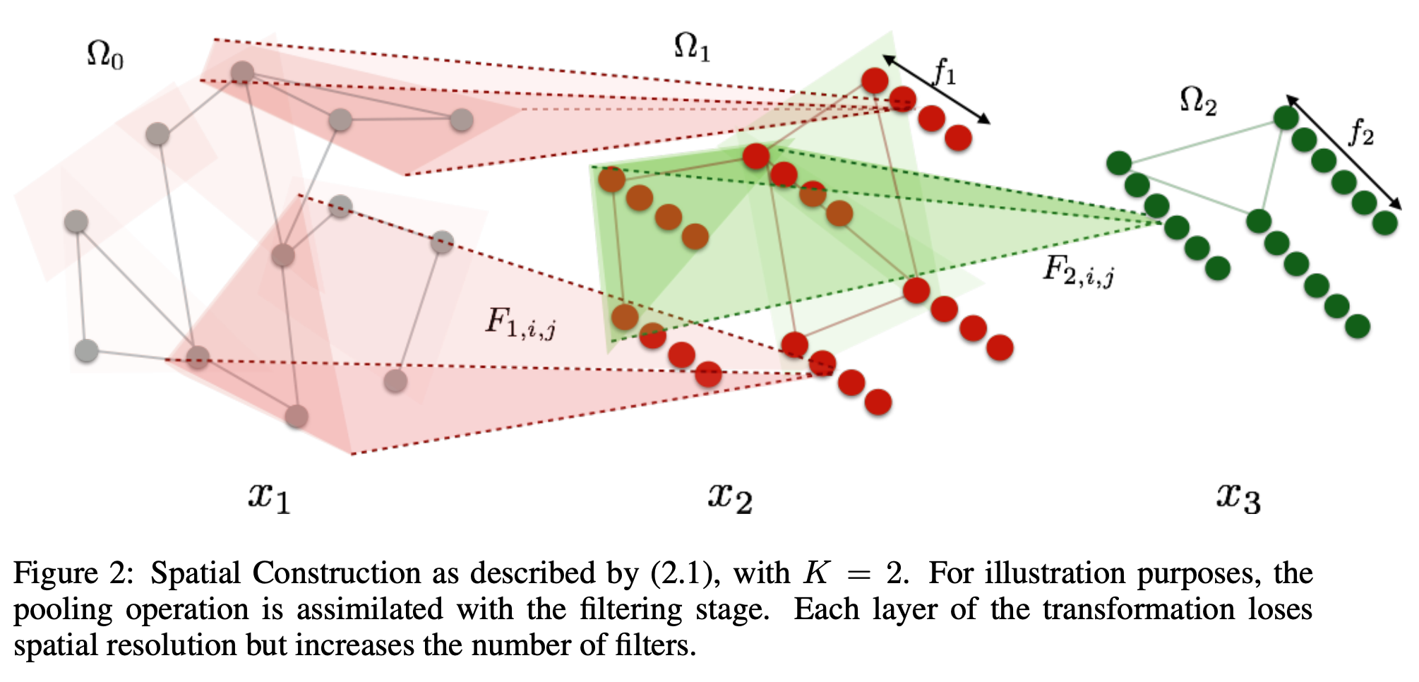The spatial construction starts with a multiscale clustering of the graph. We consider K scales. We set V0=V, and for each k=1,⋯,K, we define Vk a partition of Vk−1 into dk clusters; and a collection of neighborhoods around each element of Vk−1: