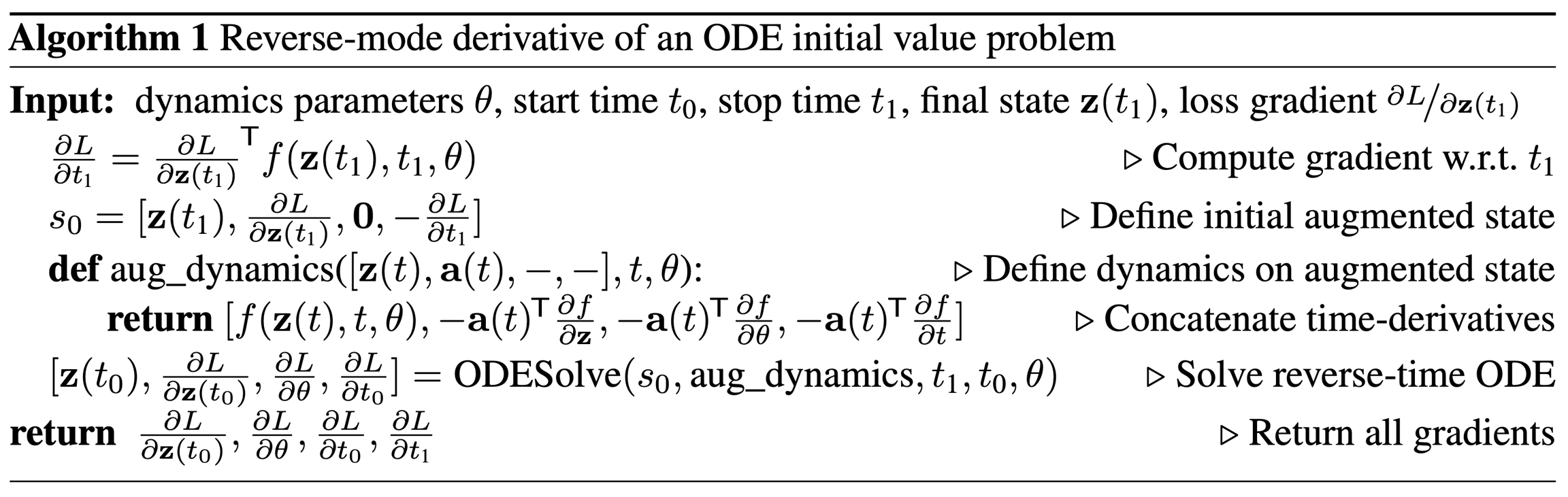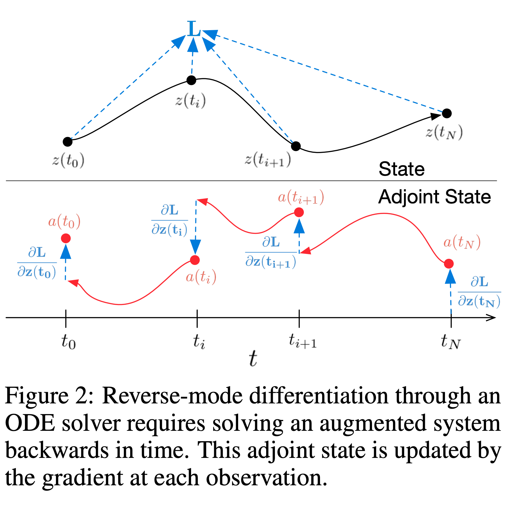 This approach computes gradients by solving a second, augmented ODE backwards in time, and is applicable to all ODE solvers.