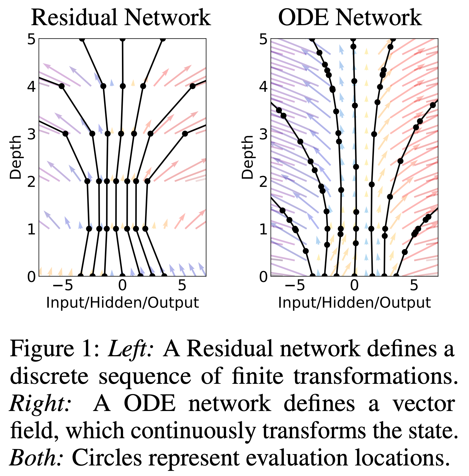 Benefits of differentiable ODE solvers include: 1. Memory efficiency: no intermediate variabels stored for chain rule, hence constant memory cost 2. Adaptive computation: the choice of ODE solver is orthogonal, different ODE solvers can be used for a same model. There are theories for ODE solvers with more than 120 years of development. Modern ODE solvers allow a controllable trade off between time cost and precission during test time. 3. Parameter sharing across layers 4. Easier computation for changing variables 5. Continuous time-series models