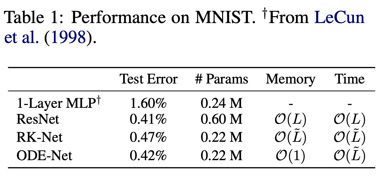The authors compared the performance of a small residual network which downsamples the input twice then applies 6 residual blocks, which are replaced by an ODESolve module in the ODE-Net variant. They also tested a network which directly BP through a Runge-Kutta integrator (a numerical method for iteratively solving an nonlinear ODE), referred to as RK-Net.